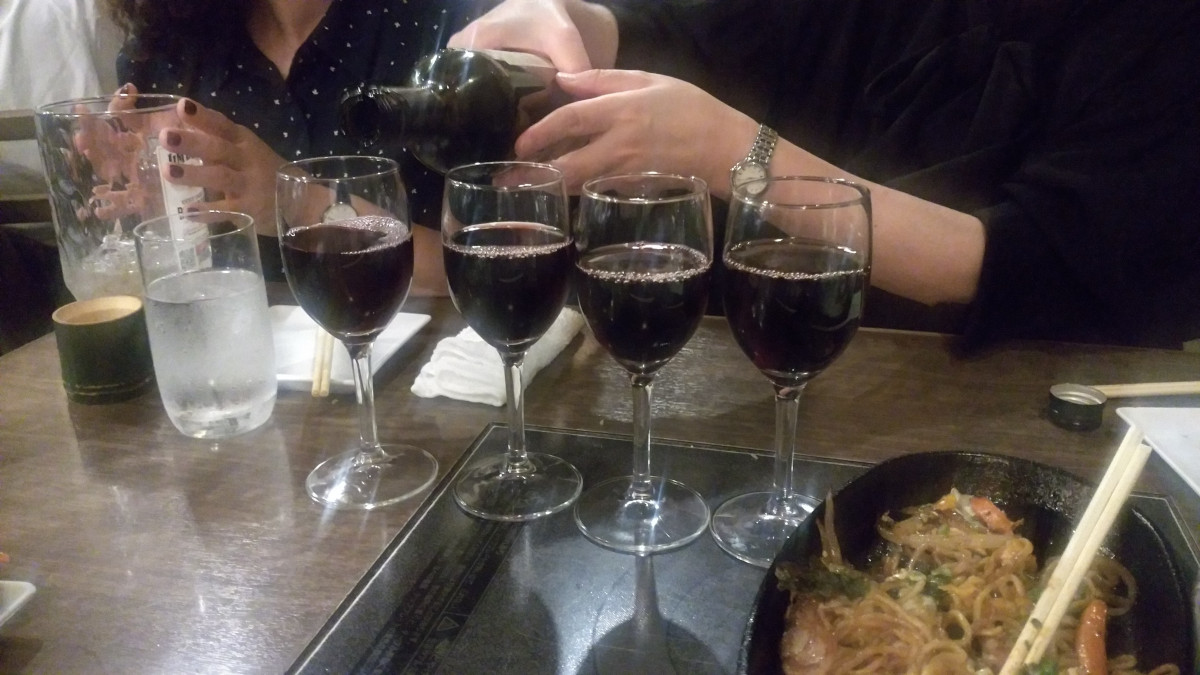 赤ワインのボトルを開けて、皆でシェアー。