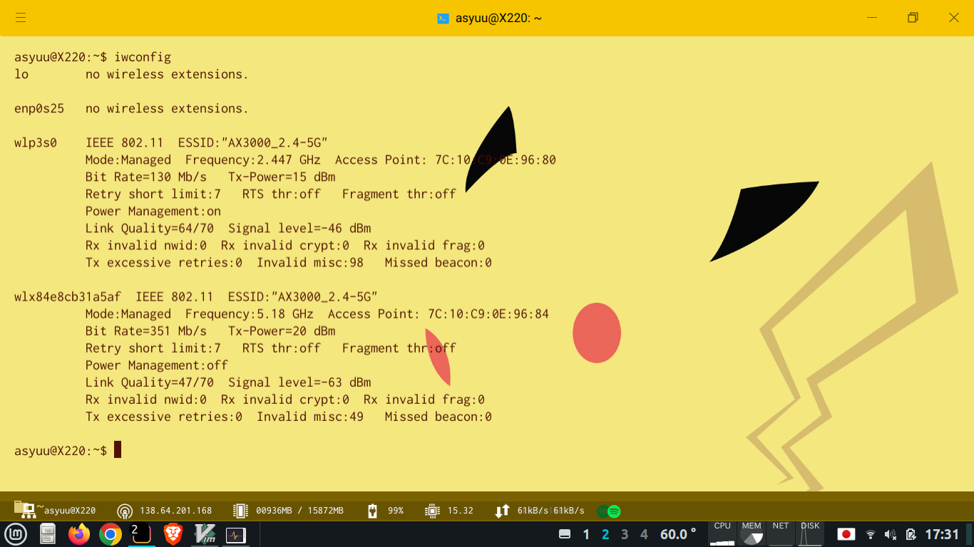 内蔵無線LANよりは高速になったけれど、カーネルがUpdateするとドライバーを再インストールする必要が生じるかもしれない